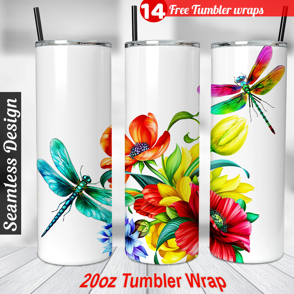 Dragonfly on Flower Tumbler wrap 20 oz tumbler Sublimation Design